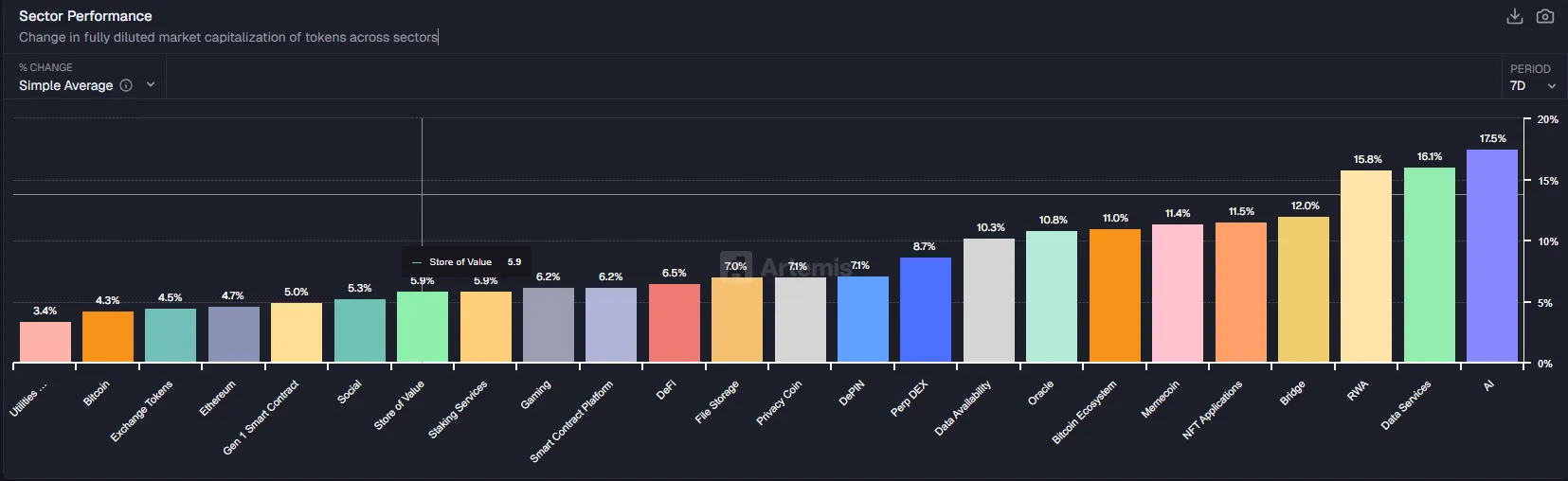板块流入流出方面,按照交易所币种板块排序,本周前所未有,所有板块均出现上涨,ai板块涨幅居前。