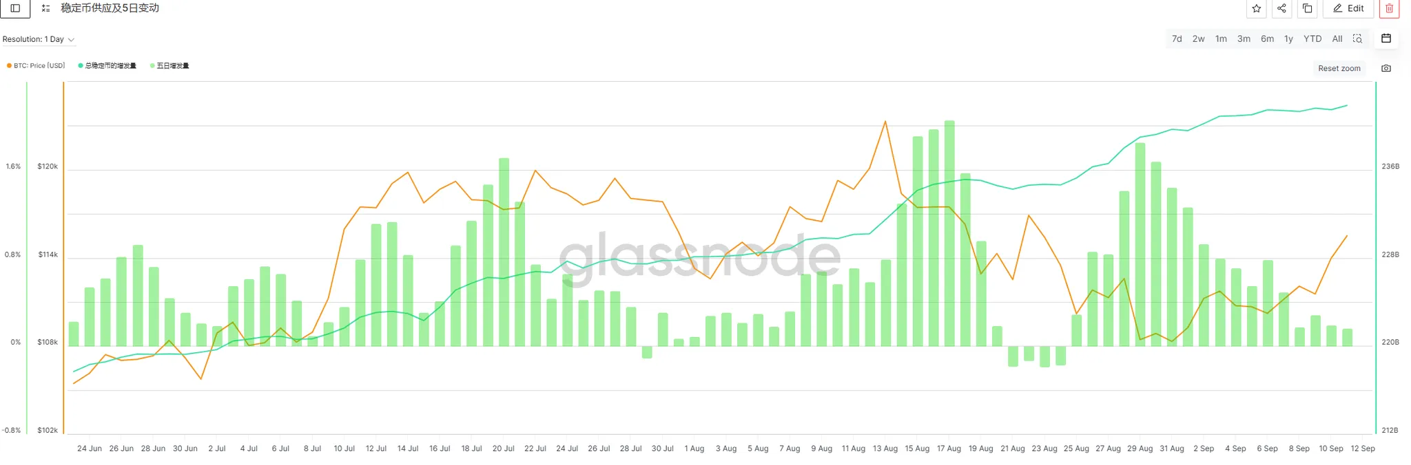 的稳定币增发水平相较于上涨来说是出于了一定的降温,单周增发量从29.12亿美元下架到9.36亿美元,日均增发也从4.16亿美元下降到1.34亿美元,整体环比下降了68%。结合单日增发量来看本周整体的增发水平降温主要是来自于本周初宏观数据还还没有完全发布时稳定币是出现了两天了单日净流出,但在本周后半段宏观数据都发布完之后市场明确了9月份的降息预期之后,稳定币的单日增发才逐渐恢复到净流入水平,整体大盘的走势也是在宏观数据都发布完之后才走出了进一步的上涨,后续上涨的持续情况还要继续关注下周的稳定币增发水平