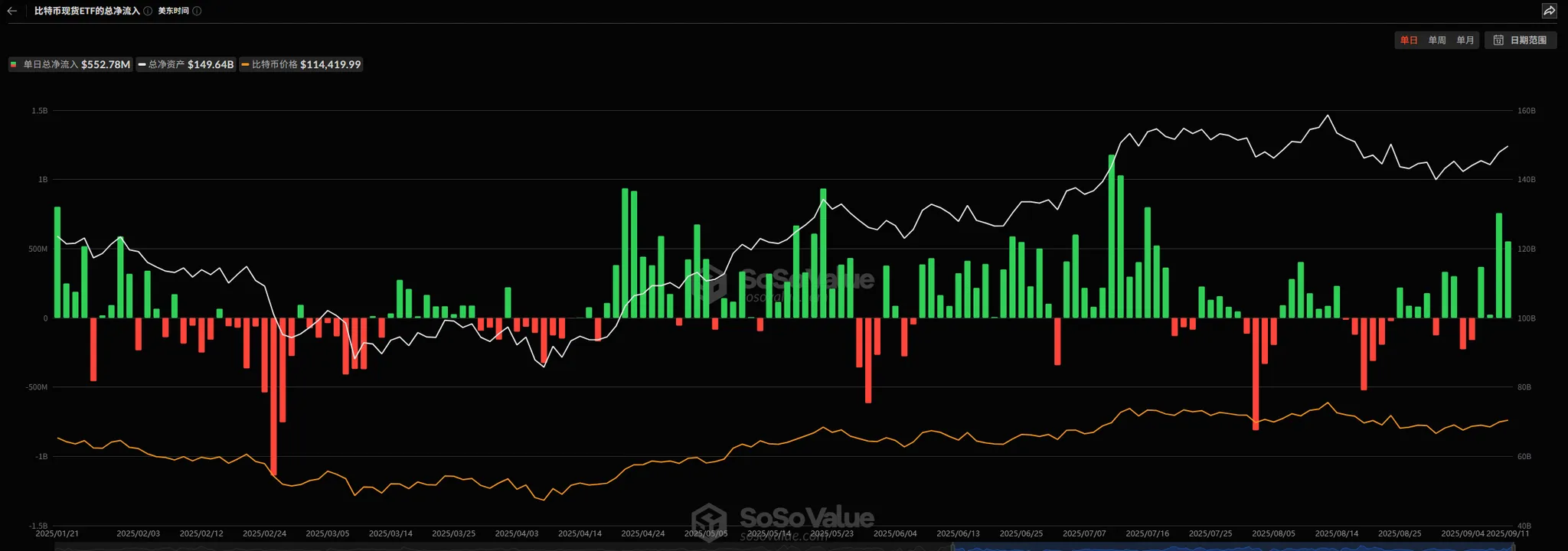 比特币的ETF资金流入水平相较于上周来说出现显著的提升,单周净流入从2.7996亿美元上升到了15.4104亿美元,环比增加了12.6108亿美元,结合单日柱状图来看可以发现本周的两个单日净流入高峰是发生在本周三周四重要宏观数据发布日,美国投资者在关键数据发布后对本月的降息预期更加明确并且点燃了投资情绪,比特币价格也出现了进一步的上涨。