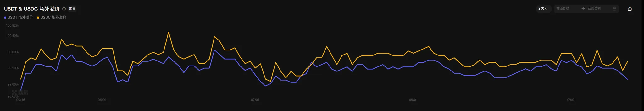 从场外折溢价的情况来看,usdt的场外溢价率呈现一个震荡向下的走势而usdc的场外溢价率呈现一个持续向下的走势,因此目前可以确定的是本周大盘持续的反弹行情暂时还并没有点燃场外资金进场fomo追涨的情绪,场外资金暂时还是更倾向于在市场回调的时候抄底。