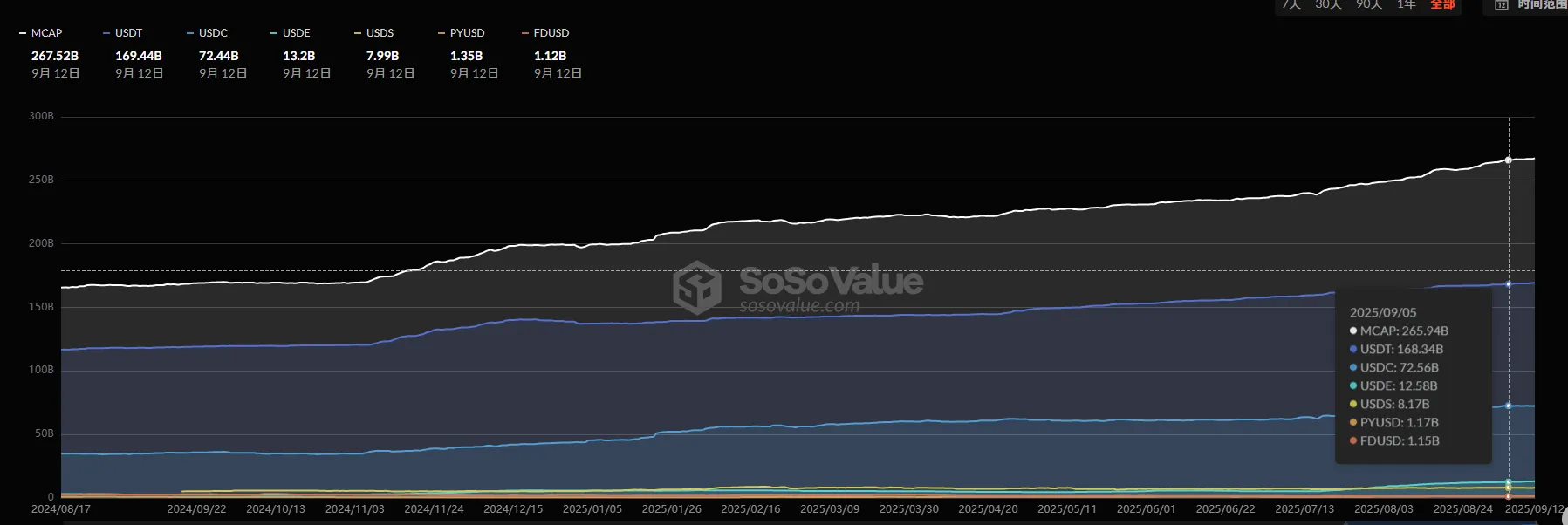 稳定币总市值2675亿美元,环比增加继续0.61%,当周增加值继续上升。