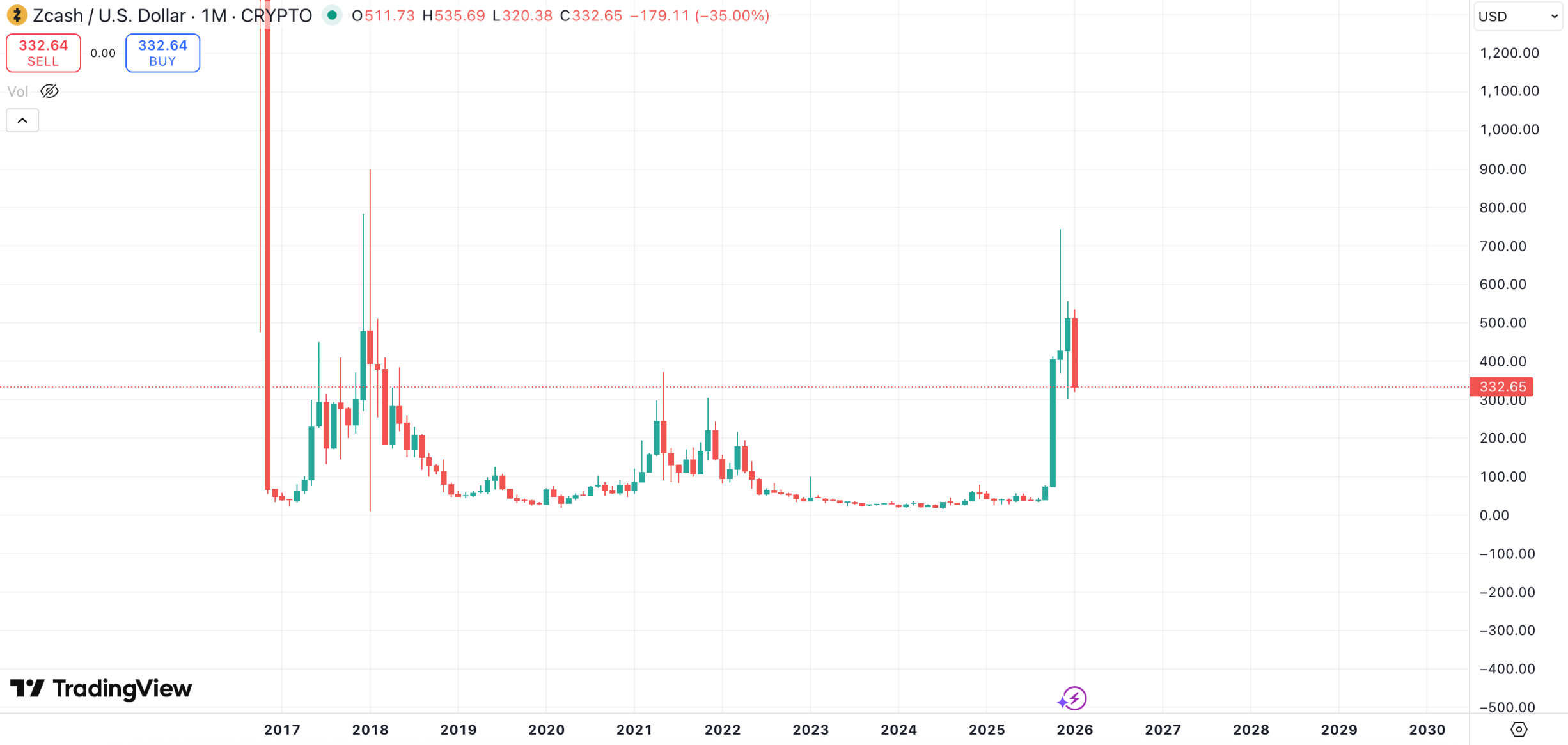 没有经历过那段时间的读者可能无法理解当时市场对于此类代币的追捧程度。那会儿比特币是否是加密货币的绝对核心都是有争议的,有很多这类代币打着「更好的比特币」旗号横冲直撞。ZEC 的价格在 2018 年初一度上涨至 3 万美元,而比特币在那一轮周期中的最高价也不到 2 万美元。