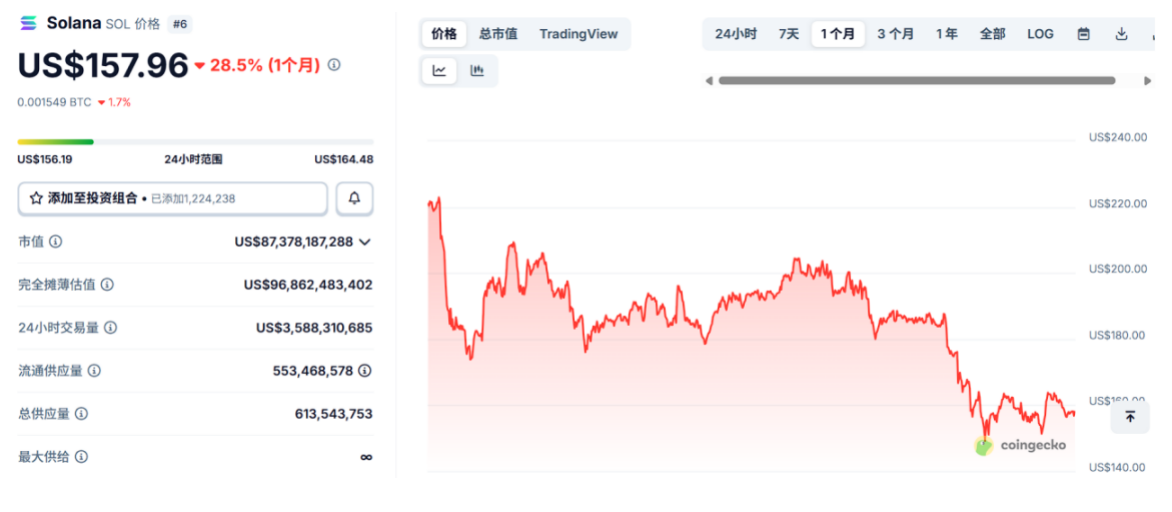 然而,与资金迅速涌入形成对比的是,SOL 短期价格表现相对平稳甚至在后续大幅回落。