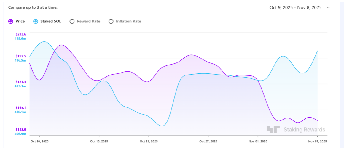 这一趋势在链上数据中亦有体现:同一时期,Solana 的质押总量上升至约 4.17 亿枚 SOL,按当期均价约 180 美元估算,总质押价值约 350 亿美元。换言之,尽管价格下行,网络的质押规模与活跃度仍在提升,反映出 链上经济基础的稳健扩张。