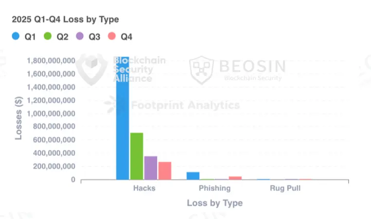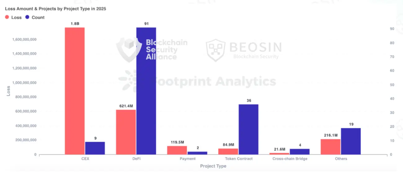2025年,钓鱼诈骗、项目方 Rug Pull所造成的金额损失较 2024年均有明显下降,然而黑客攻击频发,损失金额超过了 31 亿美元,其中损失最高的项目类型依然为交易所。而私钥泄露相关的安全事件有所减少,造成这一转变的主要原因包括: