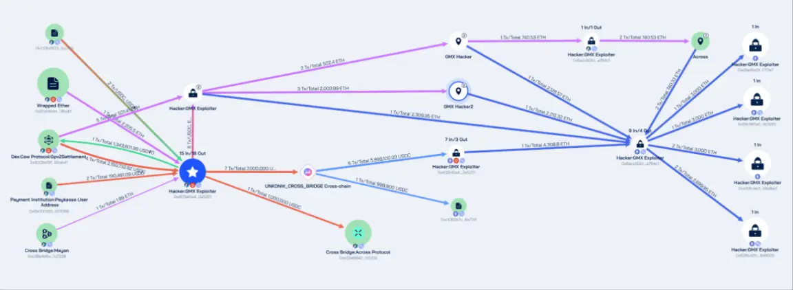 2025 年 7 月 10 日,GMX 因可重入漏洞被攻击,黑客获利约 4200 万美元。Beosin Trace 对被盗资金进行追踪发现:攻击者地址 0x7d3bd50336f64b7a473c51f54e7f0bd6771cc355在获利后通过 DEX 协议将各类稳定币和山寨币兑换成 ETH 和 USDC,并通过多个跨链协议将被盗资产转移至 Ethereum 网络。