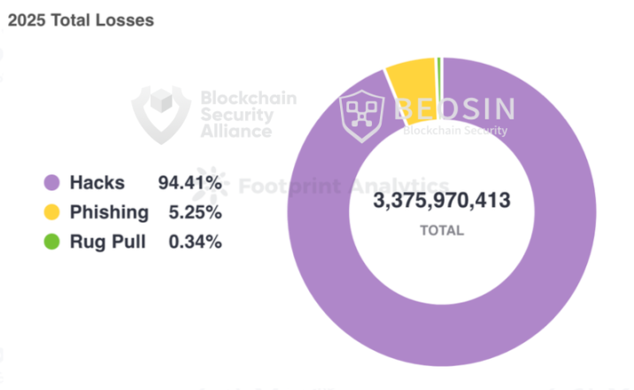 据区块链安全与合规科技公司 Beosin 旗下 Alert 平台监测,2025年 Web3 领域因黑客攻击、钓鱼诈骗和项目方Rug Pull造成的总损失达到了33.75亿美元。区块链重大安全事件共 313 起,其中黑客攻击事件 191起,总损失金额约31.87亿美元;项目方 Rug Pull 事件总损失约 1150 万美元;钓鱼诈骗 113 起,总损失金额约1.77亿美元。