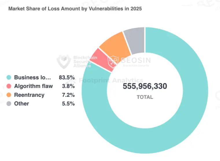 191 起攻击事件里,有62次来自于合约漏洞利用,占比达到了 32.46%,造成的总损失达 5.56 亿美元,是除 Bybit 因供应链攻击外,损失金额最大的一类攻击手段。