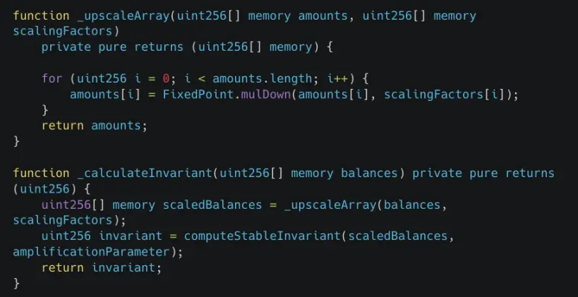 ComposableStablePools 使用 Curve 的 StableSwap 不变式公式来维持相似资产之间的价格稳定性。然而,进行不变式计算的缩放操作时会引入误差。