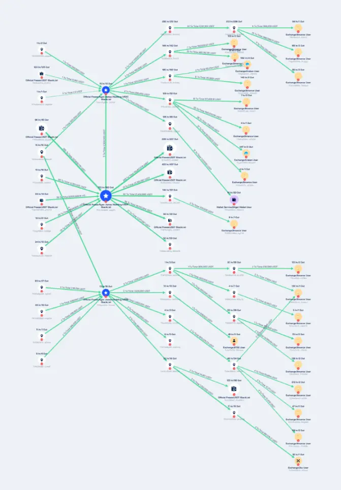 TAoLw5yD5XUoHWeBZRSZ1ExK9HMv2CiPvP、TVNyvx2astt2AB1Us67ENjfMZeEXZeiuu6 与 TPJ1JNX98MJpHueBJeF5SVSg85z8mYg1P1 这 3 个 Wedding 持有的地址共经手 266,761,784.24USDT,一部分资产已被 Tether 官方冻结,但大部分资产已经通过高频次交易的地址和多级转移完成清洗,充值到 Binance、OKX、Kraken、BTSE 等平台。