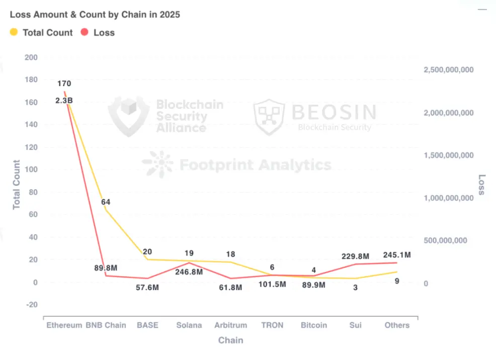 2025年Ethereum 依旧是损失金额最高的公链,170次 Ethereum 上的安全事件造成了约 22.54 亿美元的损失,占到了全年总损失的66.79%。