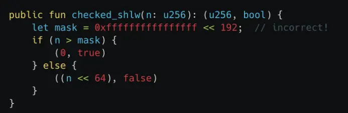 如下图所示, checked_shlw 用于判断 u256 数左移 64 位是否会导致溢出,小于 0xffffffffffffffff << 192 的输入值会绕过溢出检测,但输入值在在左移 64 位后可能会超出 u256 最大值(溢出),而 checked_shlw 仍会输出未发生溢出(false)。这样一来,在后续计算中就会严重低估所需的代币数量。