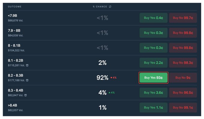 - 与之对应的 “8.2–8.3B” 区间合约,价格从六成附近被推高到 90%+;