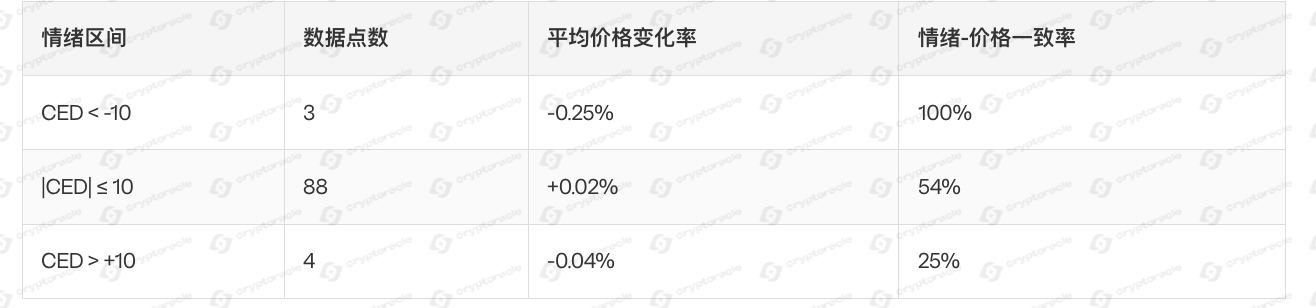 趋势结论:极端负面情绪(CED < -10)与价格下跌高度一致(100%),而极端正面情绪下价格并未同步上涨,显示市场对负面情绪反应更为敏感。中性情绪区间价格表现平稳,情绪-价格关联性较弱。