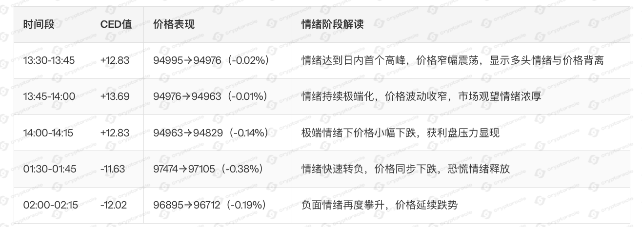 - 午后(12:00-18:00):情绪极端化明显,|CED|多次突破10,价格波动加剧
