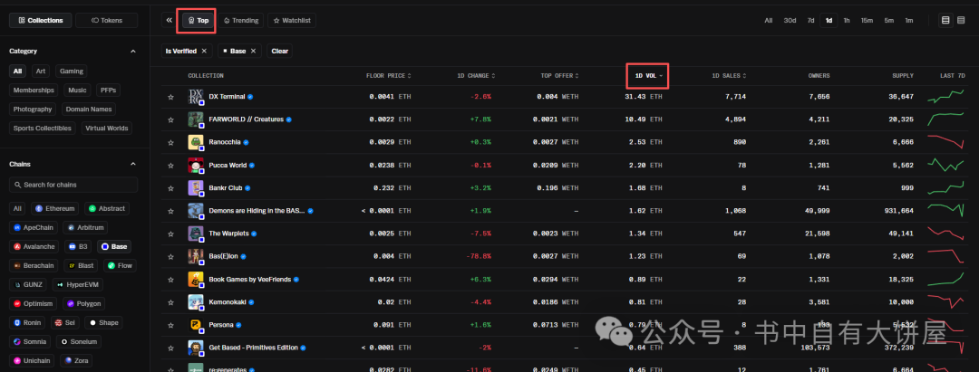 3.第二个任务交易NFT,选择顶部的top,然后尽量选择交易活跃的去刷,比如你选择1D,或者7天交易量最高的NFT。