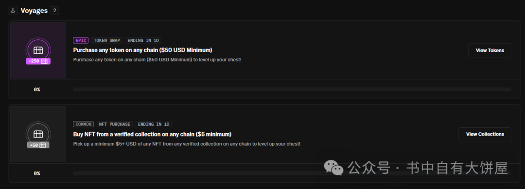 2.Vogages栏,目前有2个任务,目前新增了token purchase选项,最低要求购买50美金的token,这个步骤和你们之前刷的alpha,boost一样,刷的越多给的积分越多。