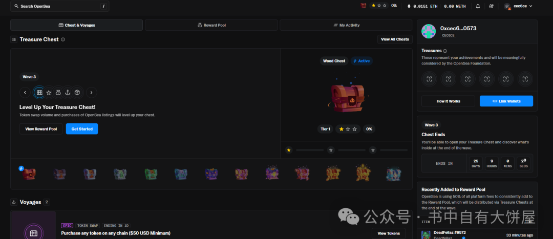 在之前的任务中,都是只需要交易NFT即可,但是这次的第三季度的Vogages任务加入了token交易,截止时间还有25天,预计可能会有5季奖励,这个活动就好比交易所里的alpha活动,活动结束可以直接获得宝箱,宝箱目前有12个等级,里面有usdc以及各类nft的奖励,当然你在做任务的过程中也相当于参与opensea的活跃,也能刷SEA TGE的空投!
