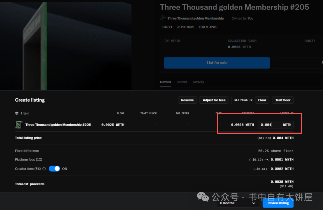 然后找到你的NFT,点击list for sale,按照你的买入价格卖出,比如上面的NFT我看流动性还不错,一直在涨,那么你就以买入价格挂单卖出即可!
