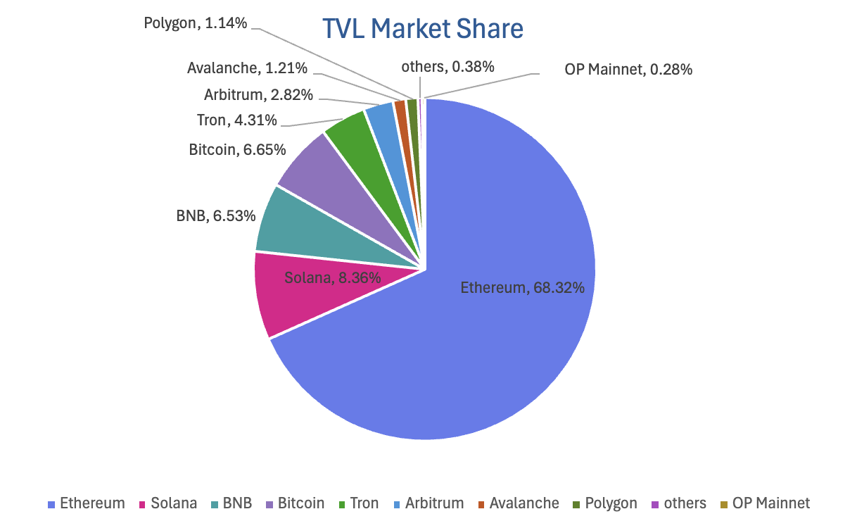 按公链进行划分,其中TVL最高的三条公链分别是Ethereum链,占比68.32%;Solana链,占比8.36%;BNB Chain,占比6.53%。