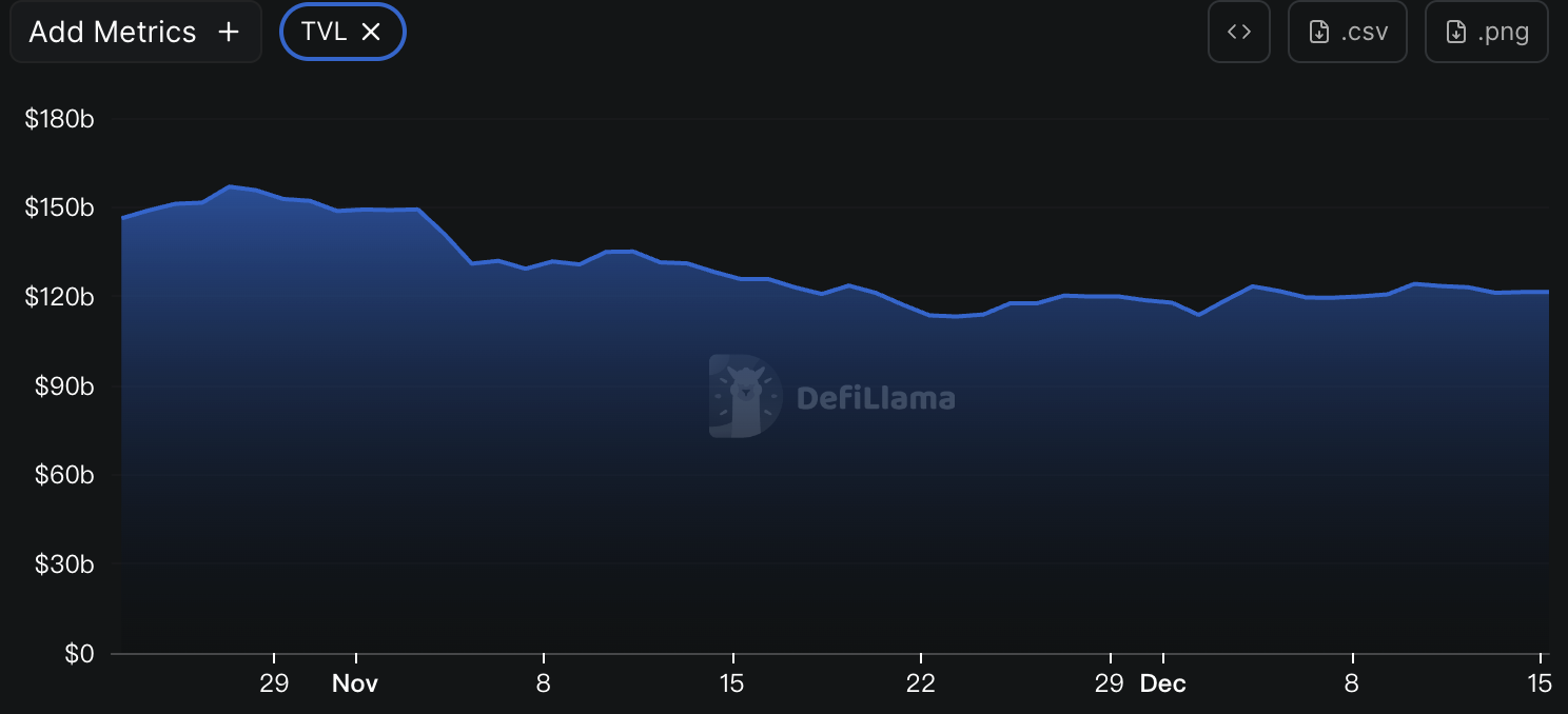 据DeFiLlama的数据,本周DeFi总TVL为$1,214亿,较上周1,208亿,上升约0.49%。