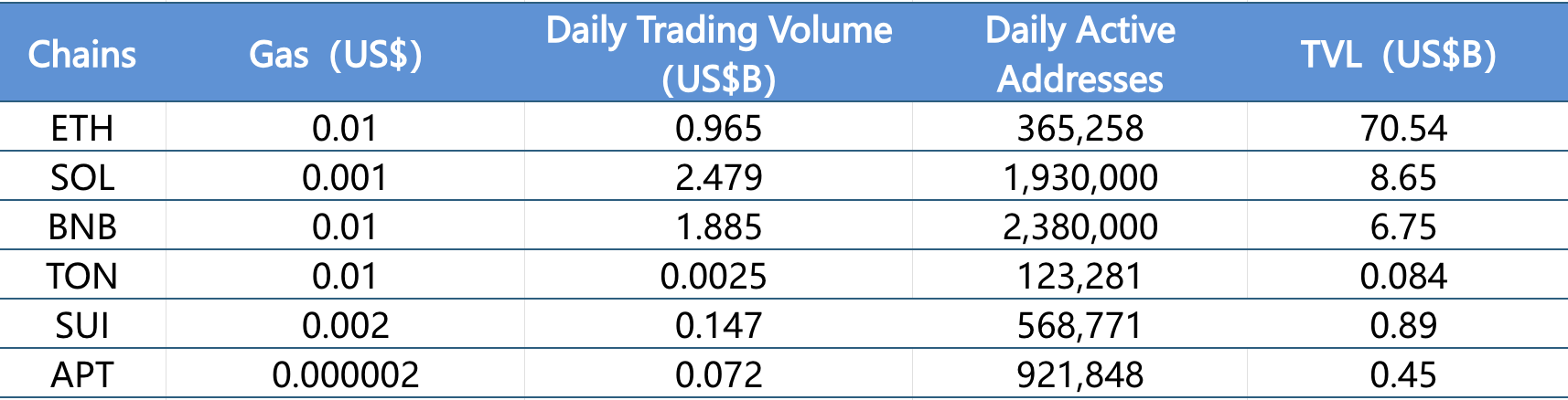 主要从日交易量、日活跃地址、交易费用分析目前主要Layer1含ETH、SOL、BNB、TON、SUI以及APTOS的相关数据。