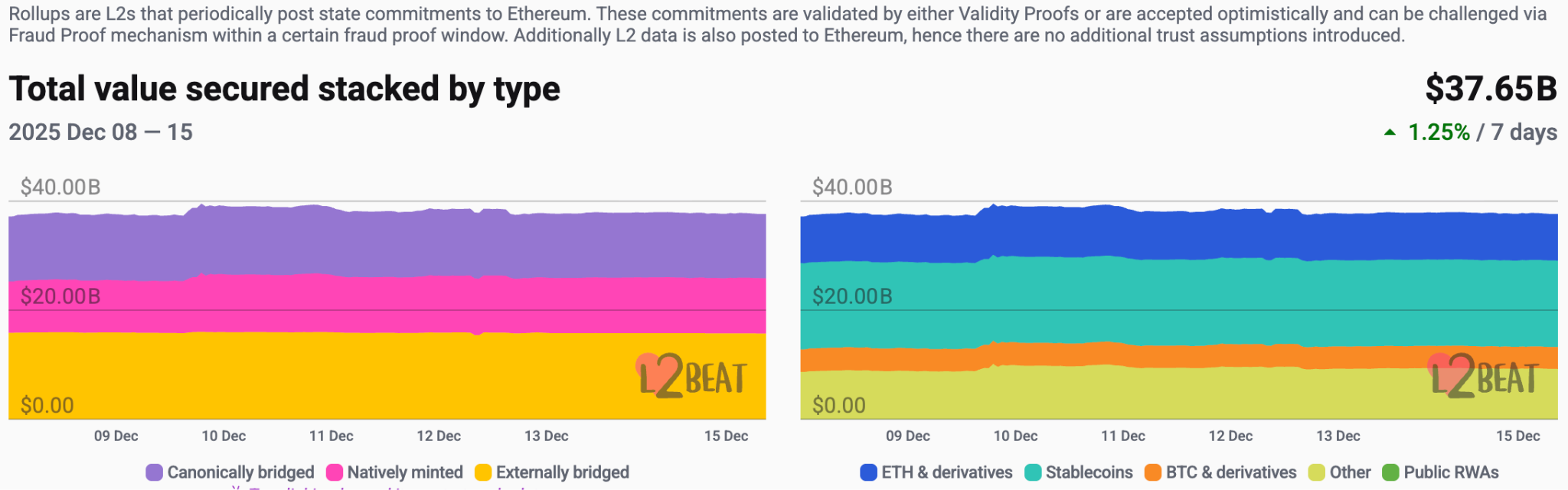 据L2Beat数据显示,以太坊 Layer 2总TVL为376.5亿美元,本周较上周($371.7亿)整体涨幅为1.4%。