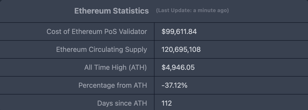 ETHUSD :现价$3,114.30,历史最高价$4,878.26,距最高价跌幅约37.12%