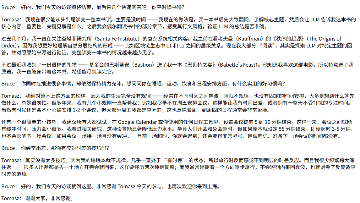 Bruce: 今天我们非常荣幸邀请到 Tomasz 做客,与我们聊聊他的个人成长历程、以太坊基金会(Ethereum Foundation)、核心协议(Protocol)以及以太坊生态中的人工智能应用。欢迎你来到上海,也感谢你今天的参与。能否先简单介绍一下自己?