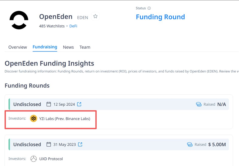 第一,OpenEden于2024年获得YZi Labs(原币安实验室)的投资。