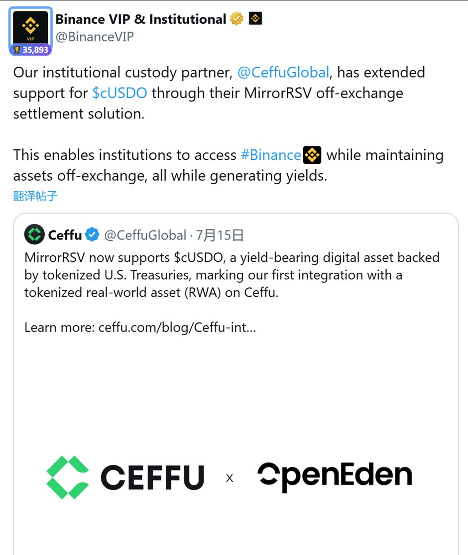 第二,OpenEden与币安及其托管机构Ceffu合作,使cUSDO成为首个可作为场外抵押品用于Binance交易的收益型数字资产。cUSDO是复利型USDO,在内部积累收益。在保证无风险收益的同时,cUSDO具备完整的 #DeFi 兼容性。