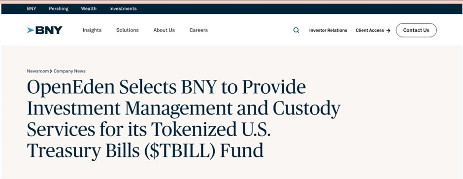 BNY官网的原文是"OpenEden选择BNY为其代币化美国国债 ($TBILL) 基金提供投资管理和托管服务"。