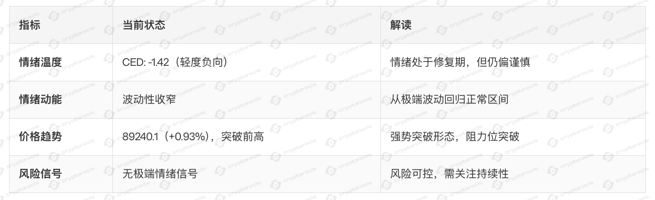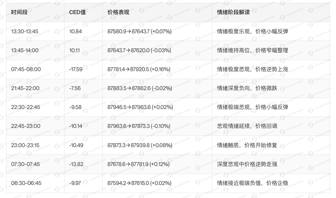 趋势结论:情绪极端化阶段(特别是CED < -10)往往对应价格反转机会,市场在过度悲观后容易出现技术性反弹。