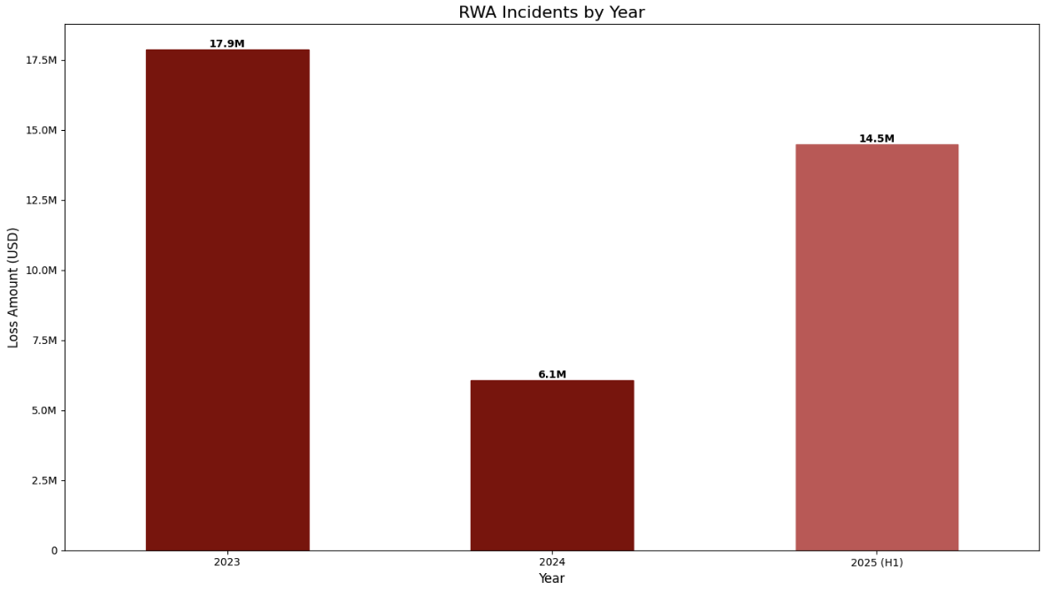 另一方面,RWA的威胁格局在过去两年中经历了重大转变。2025年上半年,RWA相关安全事件造成的损失高达1,460万美元,而2024年仅为600万美元。更值得注意的是,风险来源发生了根本性变化:2023年和2024年的主要威胁来自链下信用违约,如借款人无法履约;而2025年的损失几乎全部源于链上与运营漏洞。