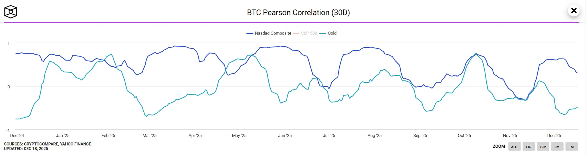 2025年,BTC与纳斯达克100指数的30日相关系数长期稳定在0.75-0.85区间,创历史新高;而与黄金的相关性降至0.2以下。当美股科技股(如英伟达、特斯拉)暴涨时,BTC ETF资金流入加速;当美股回调时,BTC同步下跌。