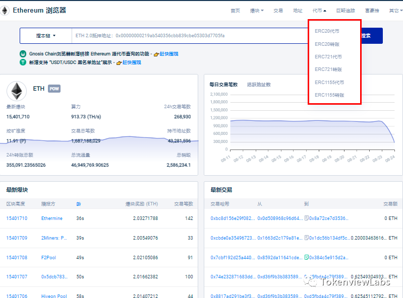 通过Tokenview浏览器,可查询实时ETH/ETC/BSC/Gnosis/Moonriver等所支持的EVM链的所有数据信息。以以太坊区块链浏览器为例,小编带领大家认识一下Tokenview浏览器提供的主要功能板块。