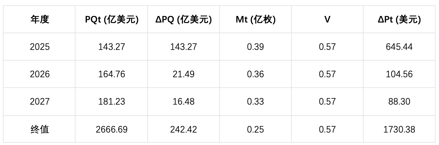 生态系统总价值(PQ)除以代币流通量与流转速率,即为代币的理论价格。这一公式是本模型的估值基础。