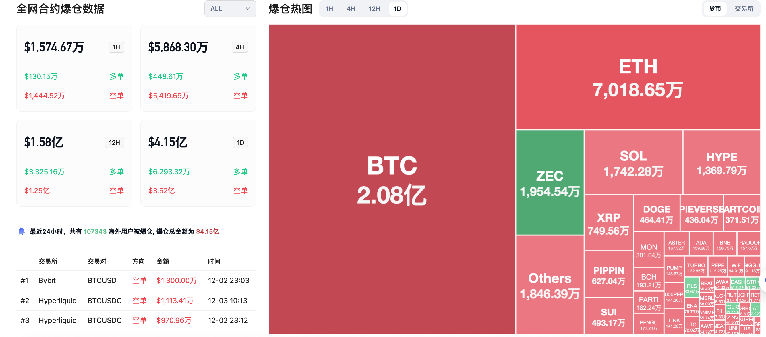 24小时爆仓数据:全球共107343人被爆仓 ,爆仓总金额为4.15亿美元,其BTC爆仓2.08亿美元、ETH爆仓7018万美元、ZEC爆仓1954万美元