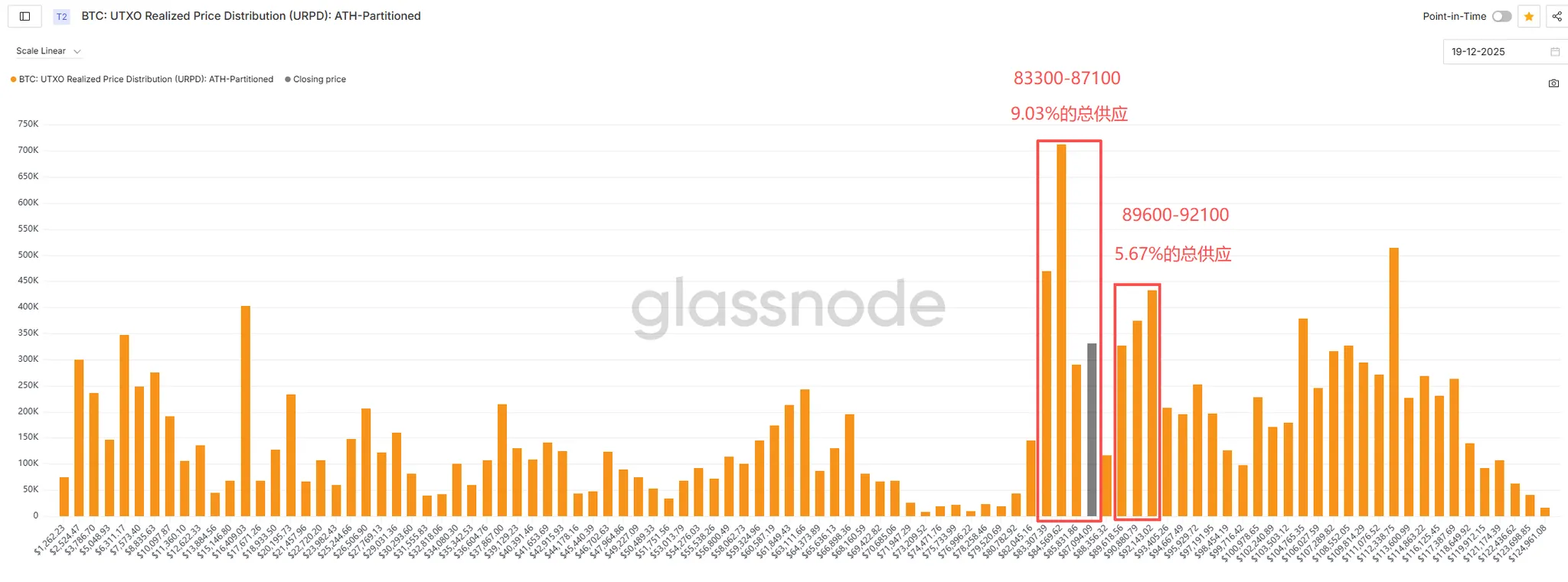 BTC 筹码结构方面,83300-87100 美元价格区间的筹码积累量从总供应的 9.03% 升至 9.93%,增加 0.9 个百分点。其中 87100 美元附近筹码积累量达总供应的 3.15%,相较于上周出现明显换手,多空博弈激烈,该价位后续有望形成强支撑。