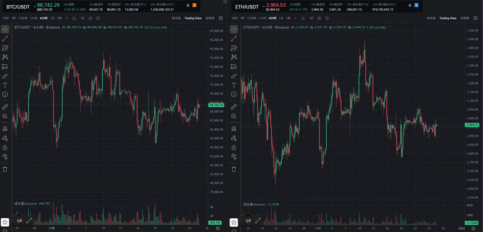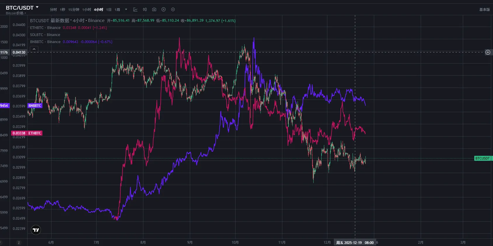 上周市场呈下跌态势,我们此前强调的 85000 美元技术支撑位表现有效。上周五 BTC 最低触及 84500 美元后,本周开启反弹走势。从日线与周线级别来看,前期持续下跌后,85000 美元支撑力度得到验证,周末市场维持反弹节奏,整体呈现震荡回升格局。