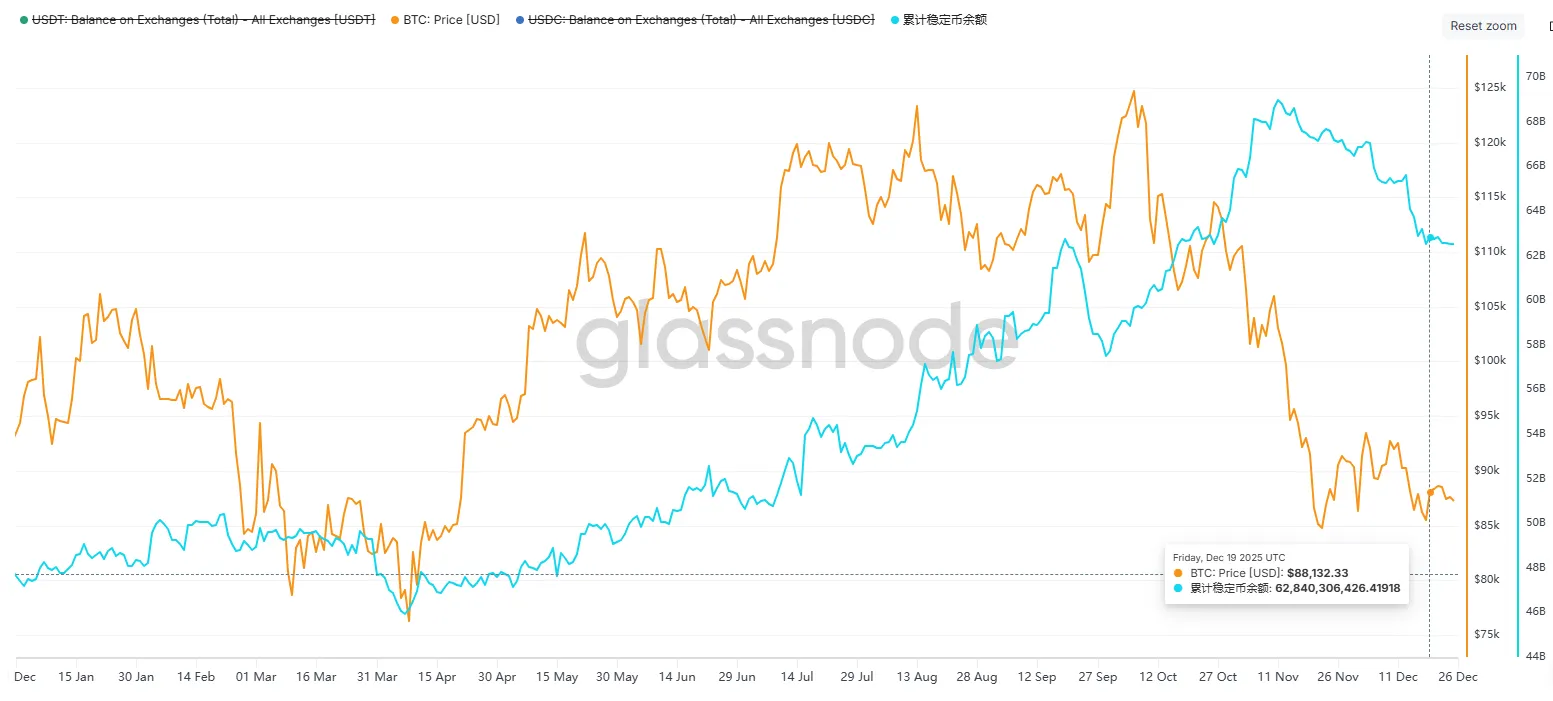 本周(12/20-12/26)稳定币单周增发量为 - 3.26 亿美元,资金延续流出态势,但流出规模显著收窄。相较于上周 - 8.24 亿美元的负增发,本周日均负增发从 - 1.177 亿美元回落至 - 0.465 亿美元,整体资金流量环比上升 60%。大盘本周以震荡为主,未出现持续性下跌,与稳定币流出减弱的趋势形成相互印证。