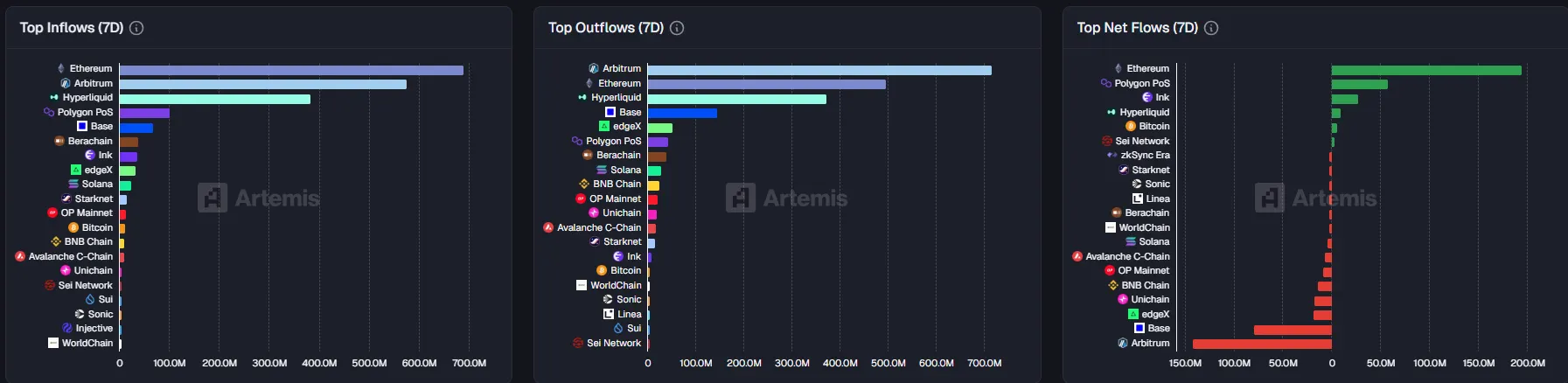 本周 USDT 增发量居前,USDC 大幅流出,CEX 资金持续大幅撤离,短期市场资金面依旧偏紧。DeFi 桥接资产流向方面,ETH 链净流入规模最大,ARB 链流出最多,整体资金流动规模较小,市场波动幅度快速收窄。