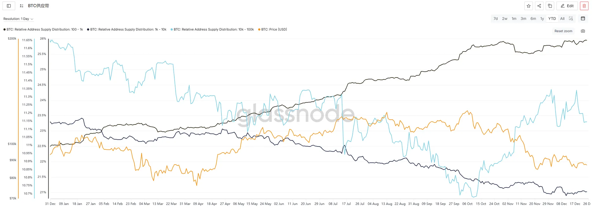 从比特币持币地址占比来看,本周 100-1K BTC 区间的持币地址占比从 25.813% 升至 25.951%,呈现小幅增持迹象;10K-100K BTC 区间占比从 11.341% 回落至 11.146%,出现一定减仓动作;1K-10K BTC 区间占比从 20.972% 微升至 21.022%,整体呈小幅震荡态势。