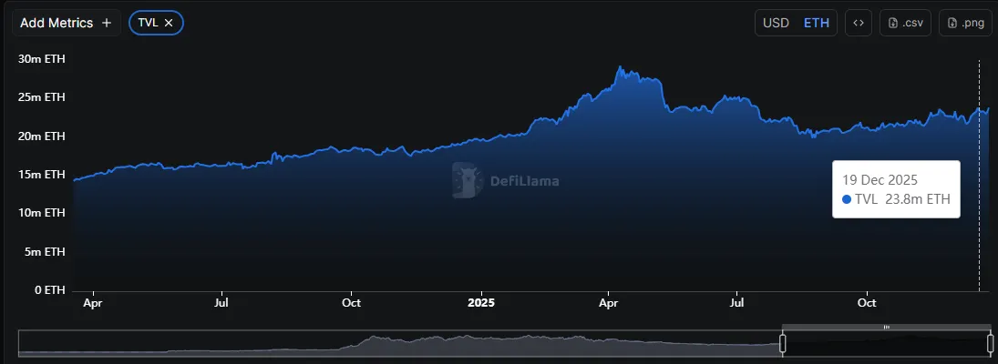 链上总 TVL 达 1175 亿美元,环比上涨 1.29%,整体呈震荡态势。ETH 质押数量保持稳定,趋势上呈现震荡走高格局,反映出长期持有者信心相对稳固。