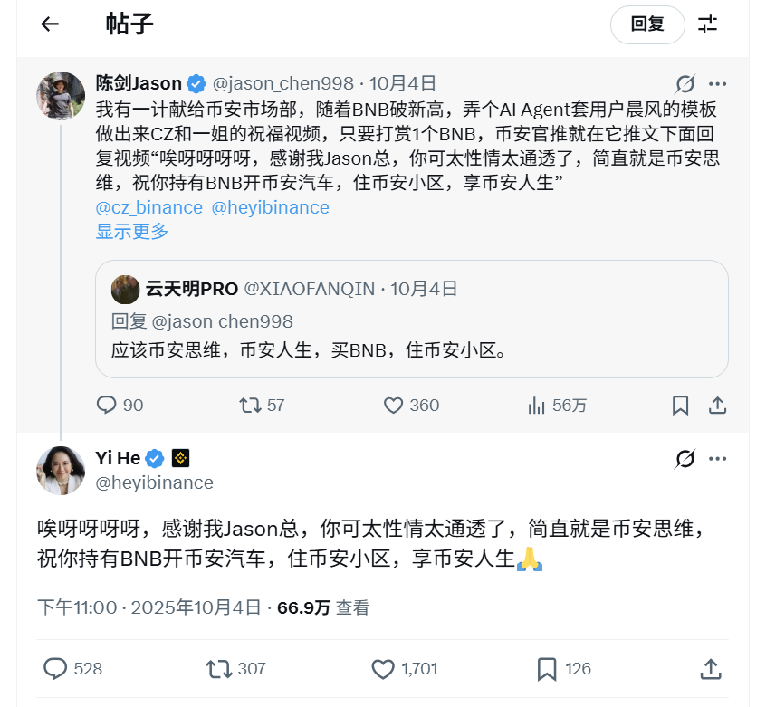 2025年10月,一个名为"币安人生"的中文Meme币在72小时内从零冲至1.5亿美元市值,成为加密史上首个由非英语文化主导的大型造富运动。这个源于抖音网红户晨风"苹果安卓论"的谐音梗,通过"开币安汽车、住币安小区、享币安人生"的口号,精准捕捉了中文社区对阶级跃迁的集体焦虑。10月7日上线Binance Alpha后,超10万投资者涌入,BSC日交易量飙升至60.5亿美元超越Solana。链上车头一度浮盈超 600 万美元,其中包括 0xSun、冷静、王小二、深大高材生、镭射猫等。
