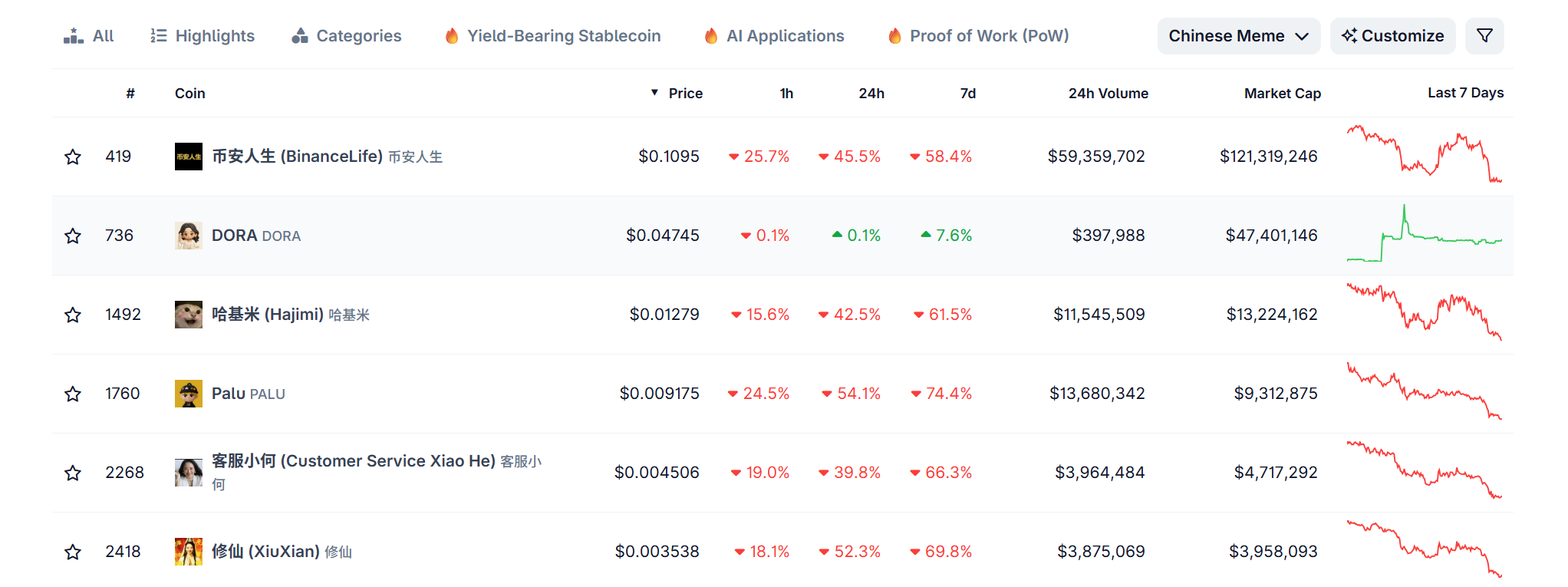 截至11月4日,中文Meme全线溃败:PALU一周跌70%,哈基米跌61%,客服小何跌66%,修仙跌69%。生命周期从周缩短至天,市值门槛从亿级降至百万级,大部分项目存活不到48小时。