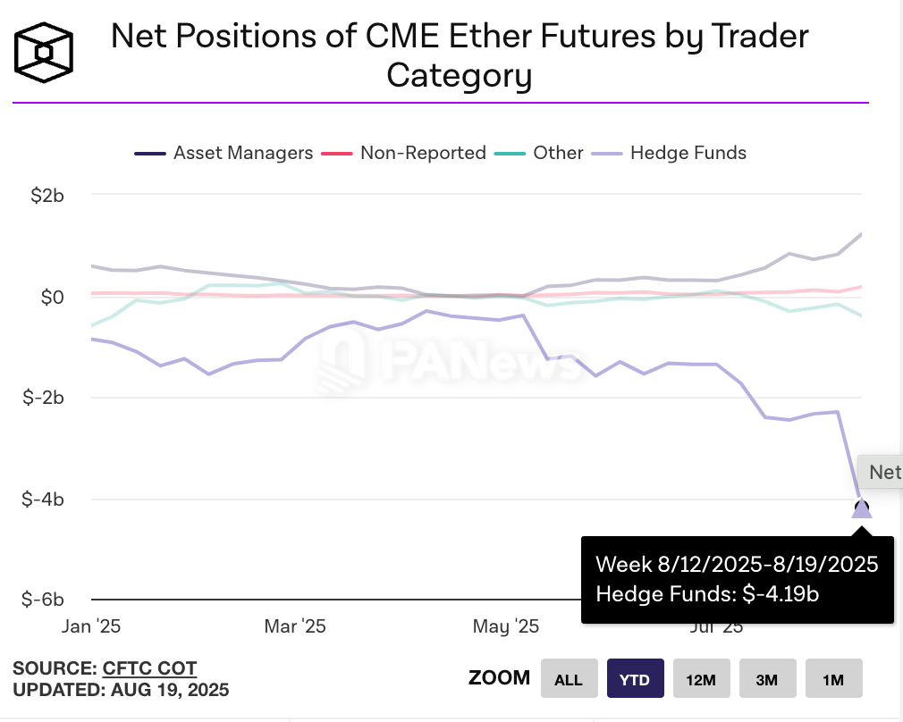 PANews 8月20日消息,据The Block数据,近期以太坊价格突破4,000美元后,对冲基金做空仓位激增,8月5日空头规模达23亿美元,现已升至41.9亿美元,创历史新高。与此同时,资产管理机构持有多头仓位达12.2亿美元,未报告仓位为正7750万美元,“其他”类别净空头为-3.975亿美元。分析称,空头仓位高企或引发短线挤压,推动价格波动。