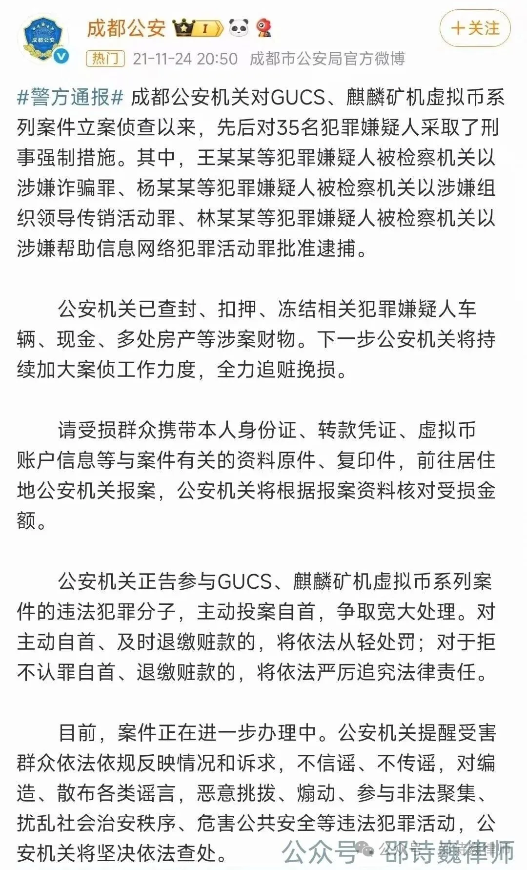 成都“GUCS麒麟矿机”案是近年规模较大的案件之一。2023年,法院对该案作出判决:主犯因集资诈骗罪被判处无期徒刑,核心成员因组织、领导传销活动罪获刑15年,部分人员还因掩饰、隐瞒犯罪所得罪、帮助信息网络犯罪活动罪承担刑责。涉案金额高达十余亿元,参与人数遍及全国。