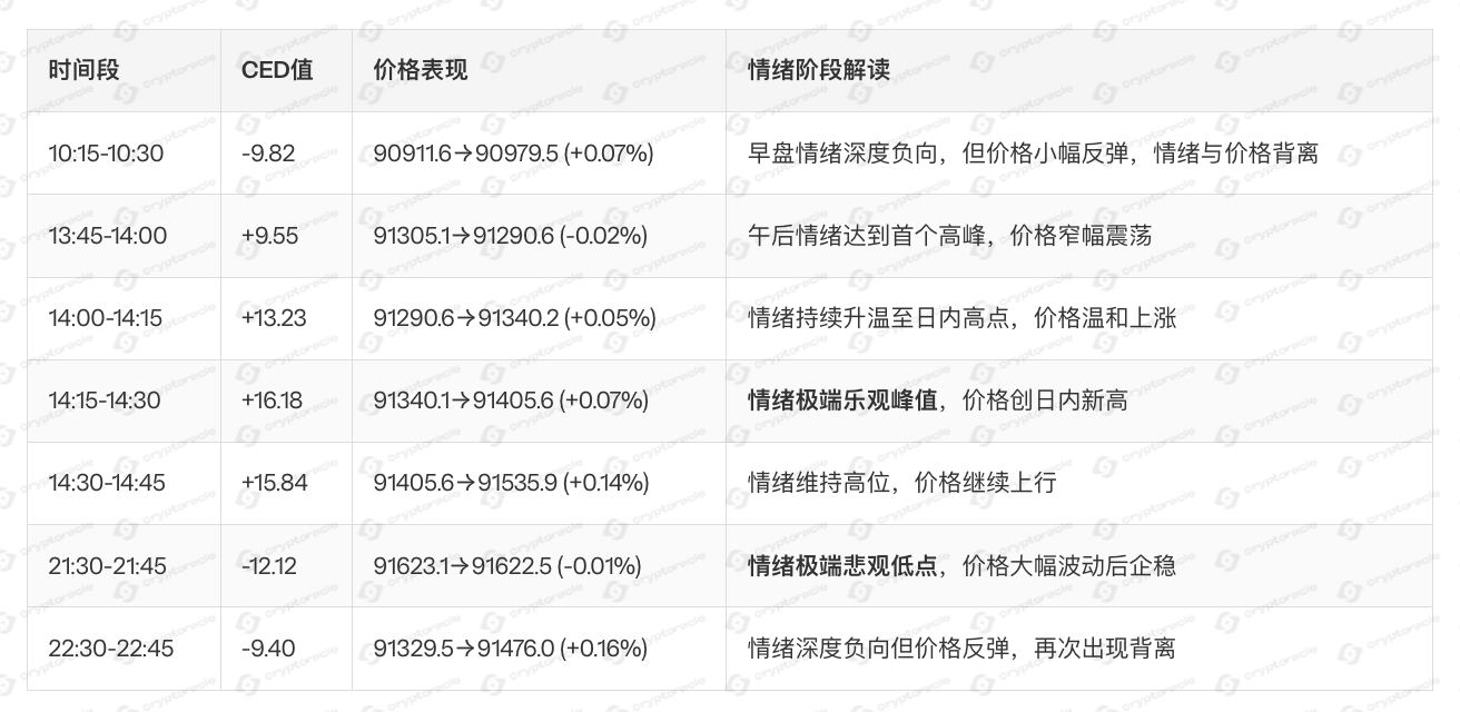 总体情绪走势:过去24小时内BTC情绪呈现"先负后正再转负"的波动格局,整体偏向负向波动,CED值在-12.12至+16.18区间内震荡。