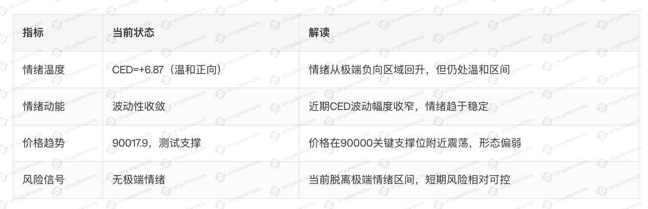 当前BTC市场情绪已从晚间极端悲观区域修复至温和正向区间,但价格仍在关键支撑位附近挣扎。情绪极端化阶段往往预示价格反转机会,近期需关注90000美元支撑有效性。市场整体处于情绪修复期,缺乏明确方向性动能,预计短期将继续震荡整理格局。情绪指标显示市场参与者心态趋于谨慎,建议等待更明确的基本面或技术面信号。